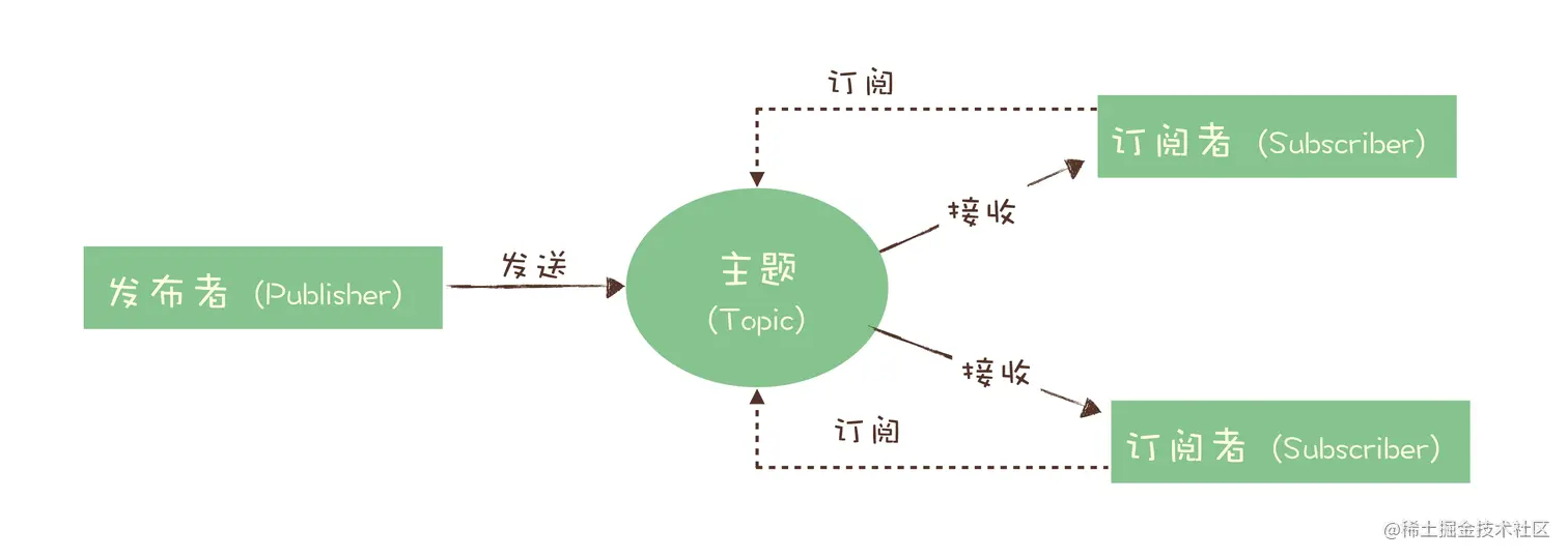 发布者将消息发送到主题中,订阅者在接收消息之前需要先“订阅主题”,每份订阅中,订阅者都可以接收到主题的所有消息。