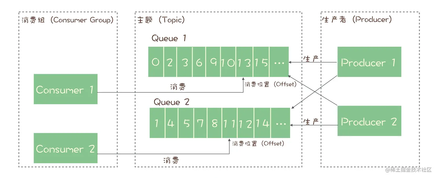 - 解决办法:一个Topic开多个队列(队列数量可以水平扩展),通过多个队列来实现多实例并行生产和消费。生产者将其消息发送给主题中的某个队列(根据一定的路由规则,比如取模之类的),主题不保证消息的有序,只有队列中的消息才是有序的。