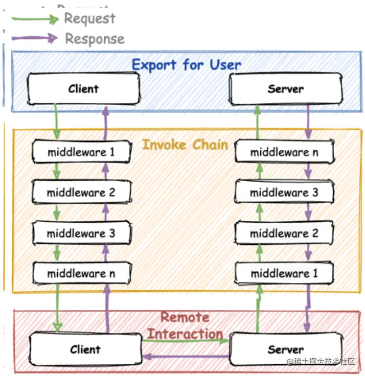 - Middleware:middleware 会被构造成一个有序调用链逐个执行,比如服务发现、路由、负载均衡、超时控制等