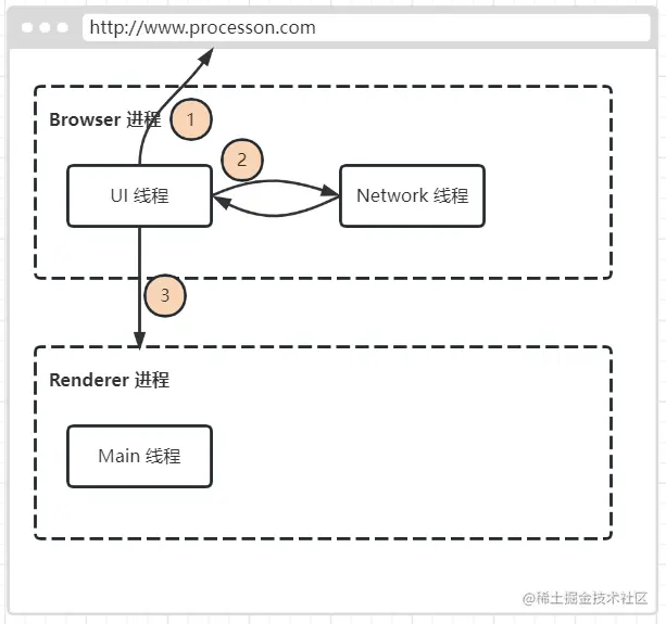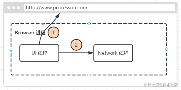 以 Chrome 举例,当我们打开浏览器时,便创建了 Browser 浏览器进程 ,内部会启动 UI 线程 , Network 线程 对用户输入的 URL 地址做页面跳转,以及负责后续的资源加载。