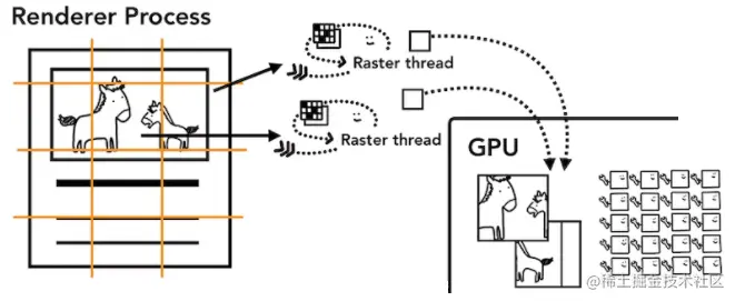 一旦上述工作完成后, main 线程 会告知 compositor 排版线程,它会将内容交给 raster 线程 进行光栅化(rasterizes),然后交给GPU处理。