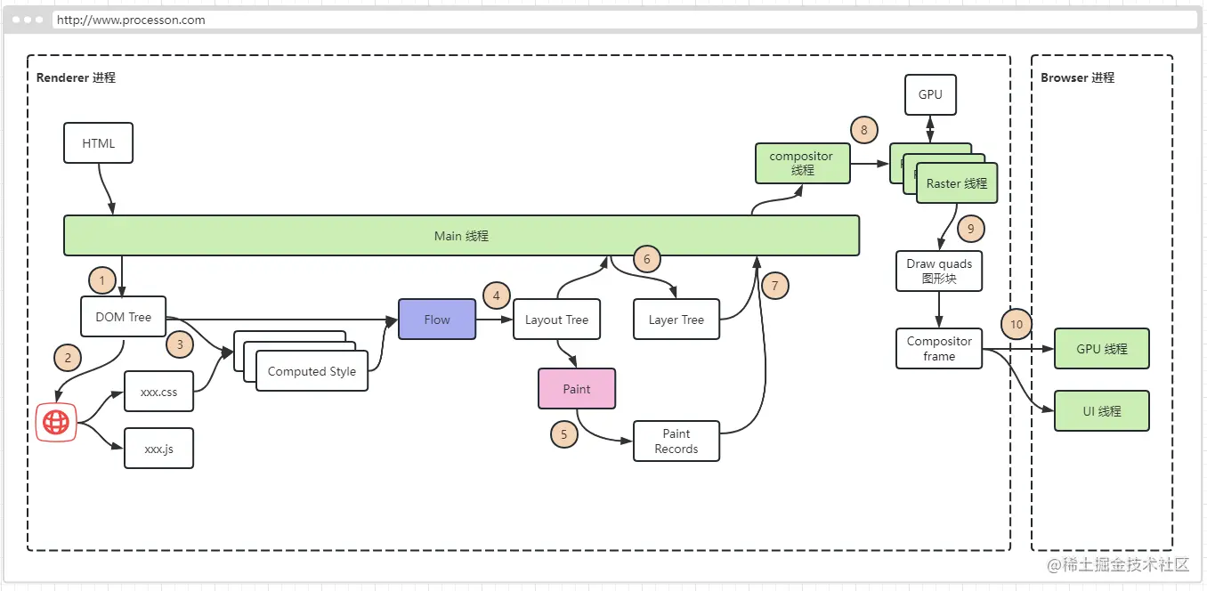 页面的渲染会通过 Renderer 渲染进程 进行,整个过程通过 Main主线程 来串连。渲染的内容会涉及 Compositor 线程 和 Raster 线程 。 下面针对 在浏览器输入 URL 后发生了什么? 这一问题,列举几个重要的步骤进行说明: