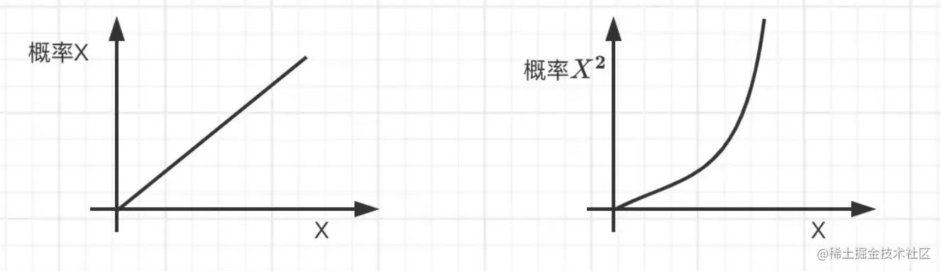 从上面也可以看出,其实哈,我们的随机数出现的概率是一条 y=x 直线,那么如果我们要讲概率改变为 y=x^2 变为一个曲线,那么我们该怎么处理呢?