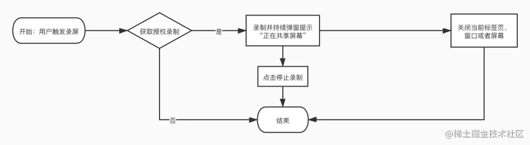 使用 navigator.mediaDevices.getDisplayMedia 初始化录屏,触发弹窗获取用户授权。