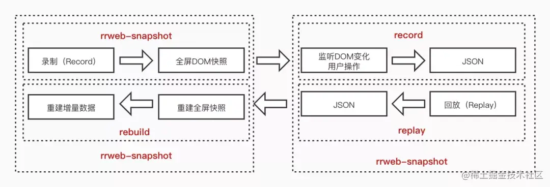 rrweb 提供 record 和 replay 两个 API,分别实现记录所有增量数据和将记录的数据按照时间戳回放的两个功能。