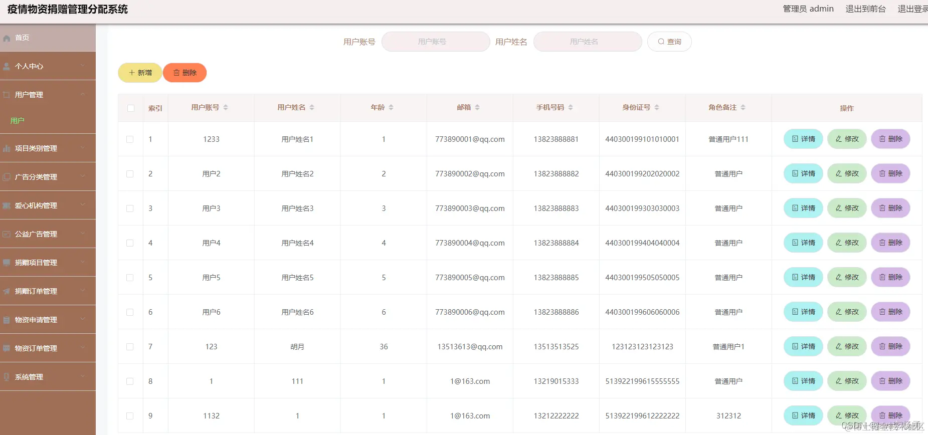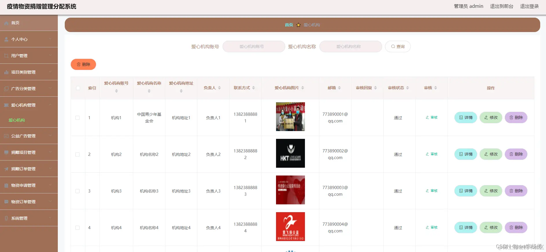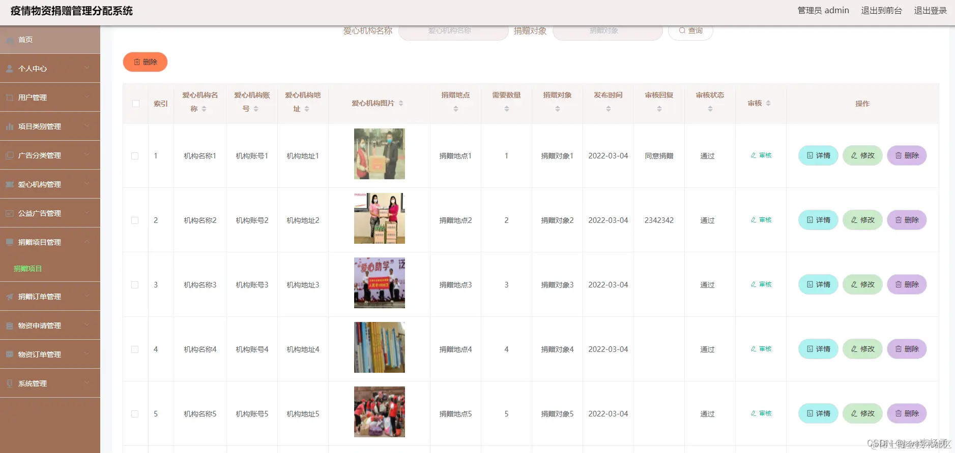 3、功能的完善性:可以管理首页、个人中心、用户管理、项目类别管理、广告分类管理、机构管理、广告信息管理、捐赠项目管理、物资信息管理,物资申请,审核,物资订单等,捐赠订单管理以及系统管理模块的修改和维护操作。