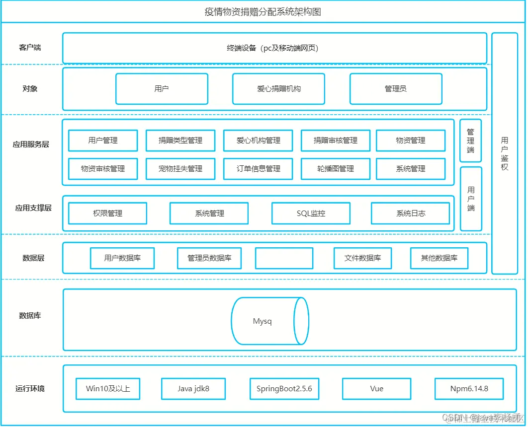 系统架构图属于系统设计阶段,系统架构图只是这个阶段一个产物,系统的总体架构决定了整个系统的模式,是系统的基础。疫情物资捐赠分配系统的整体结构设计如图所示。