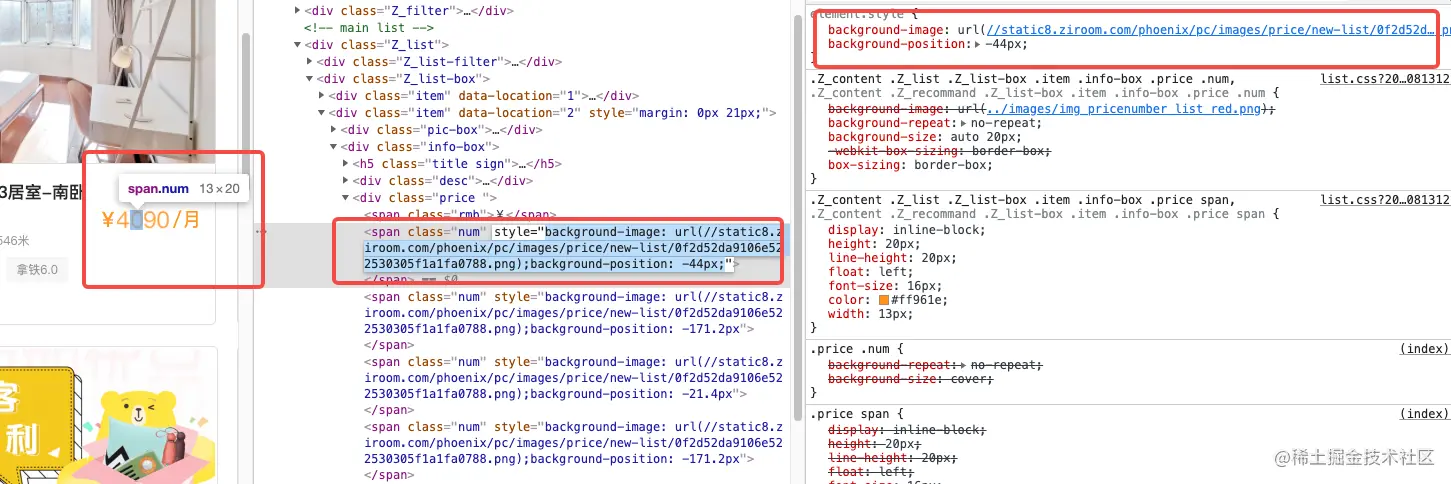 backgroundImage雪碧图策略同样也被很多行业大咖公司使用,比如早期的美团,比如自如租房等。我们以自如租房为例,打开审查元素发现,自如的敏感数据,采用的是style: background-image使用雪碧图,然后调整对应的位移位置的方式。