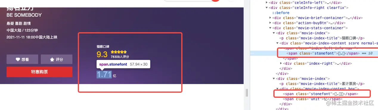 以猫眼电影为例,打开审查元素,发现页面内的票房和口碑分数的数字均变成了乱码。所以即便爬虫找到了正确位置,也依然无法获得正确信息。