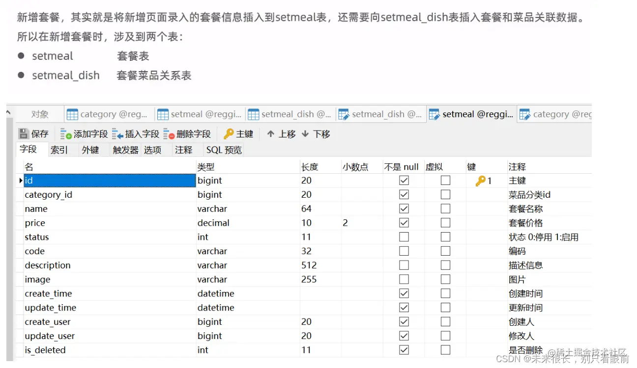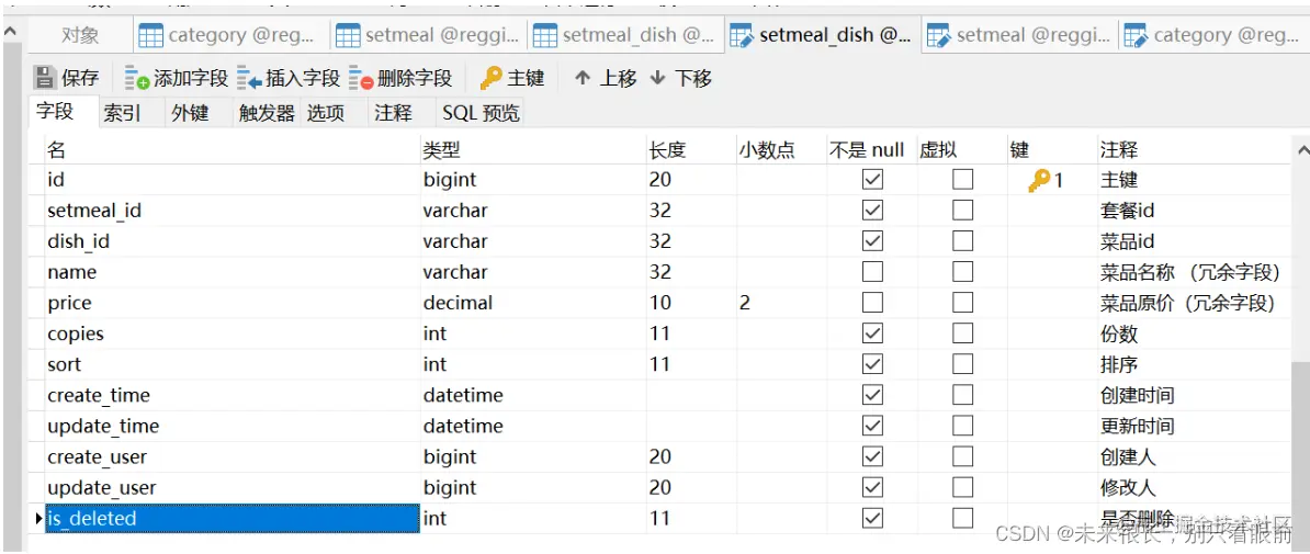 | 5 | setmeal_dish | 套餐菜品关系表 |