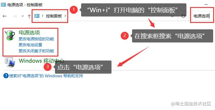 第1步: 按下【Win+i】打开电脑的【控制面板】,在右侧的搜索框内输入【电源选项】,就会快速查找到它,单击【电源选项】;