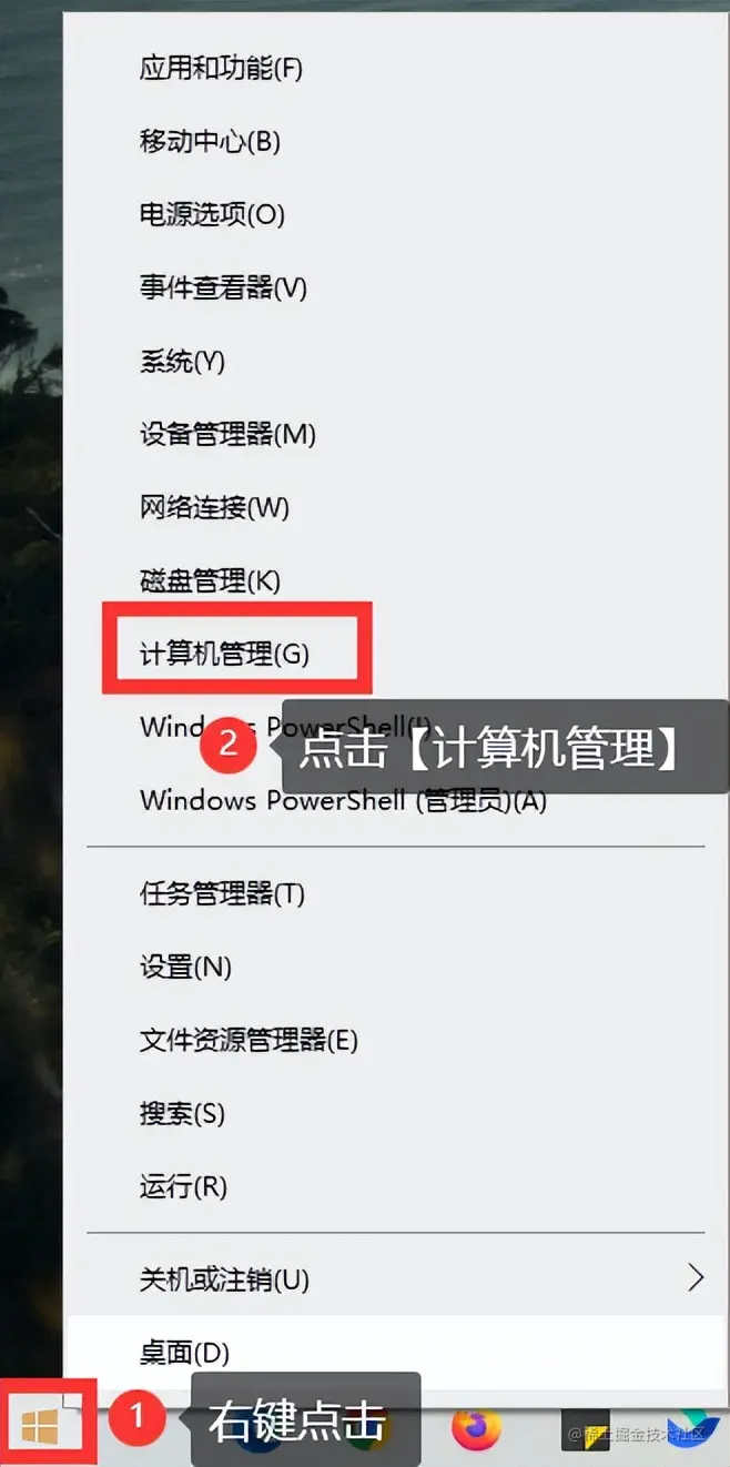 **步骤1:**右键点击电脑左下角的开始菜单,找到并点击上方选项中的【计算机管理】