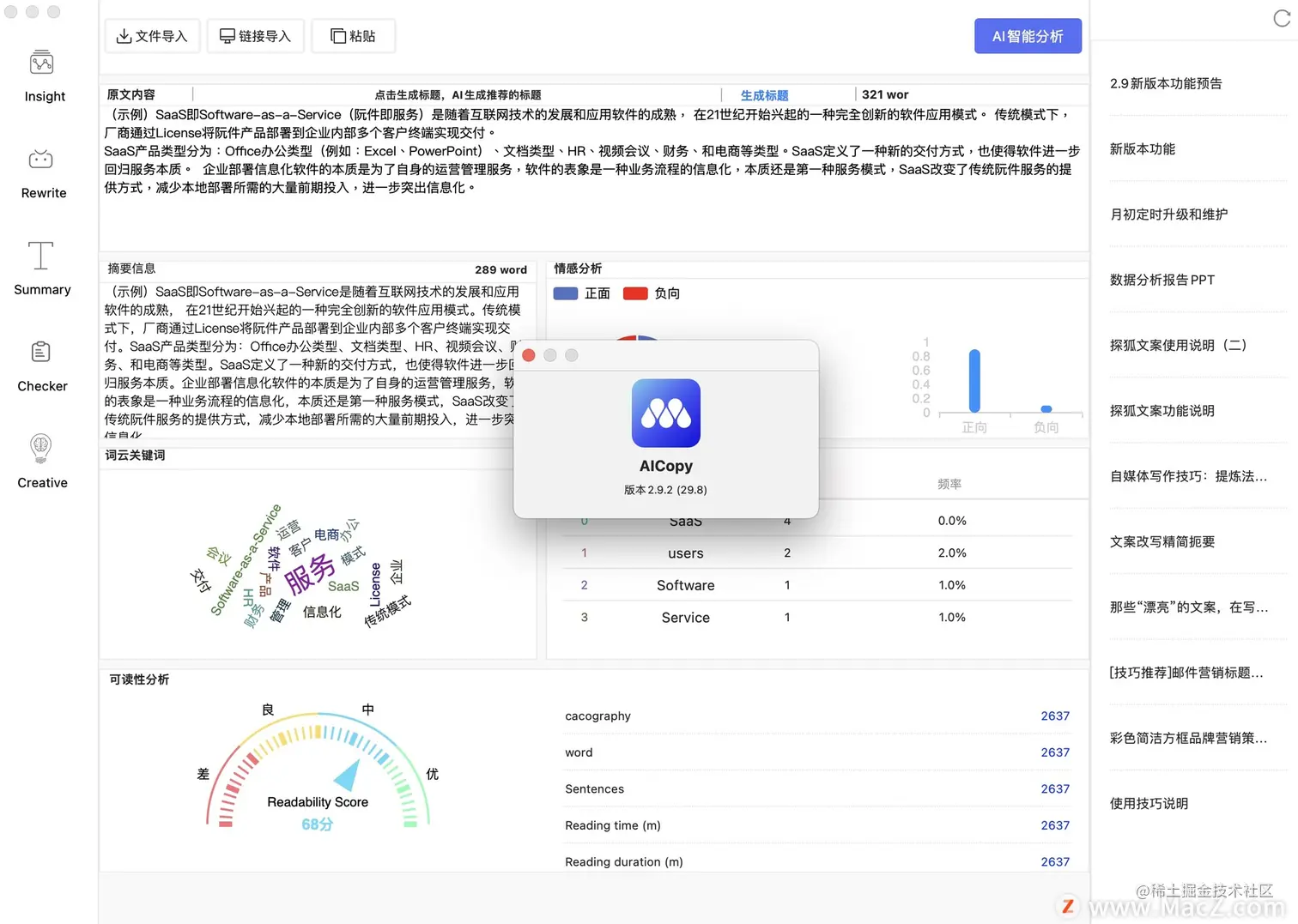 如何创建博客文章?推荐您使用AlCopy探狐文案 for mac,100% 安全可靠,引入原文,一键生成2分钟智能原文,并且摘要工具可以总结文本重点,帮助您过滤研究论文、新闻文章和冗长的电子邮件,是一款值得收藏的博客论文写作软件。 AICopy探狐文案 for mac(博客论文写作软件)