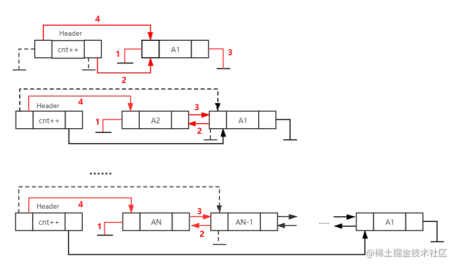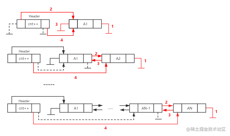 - 4、将链表的尾指针指向此节点; 其基本逻辑如下图所示: