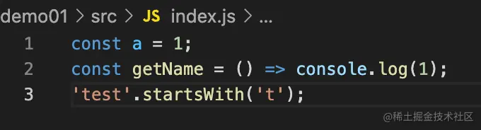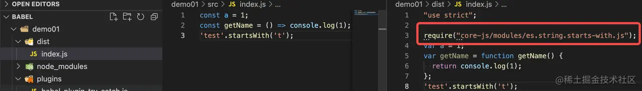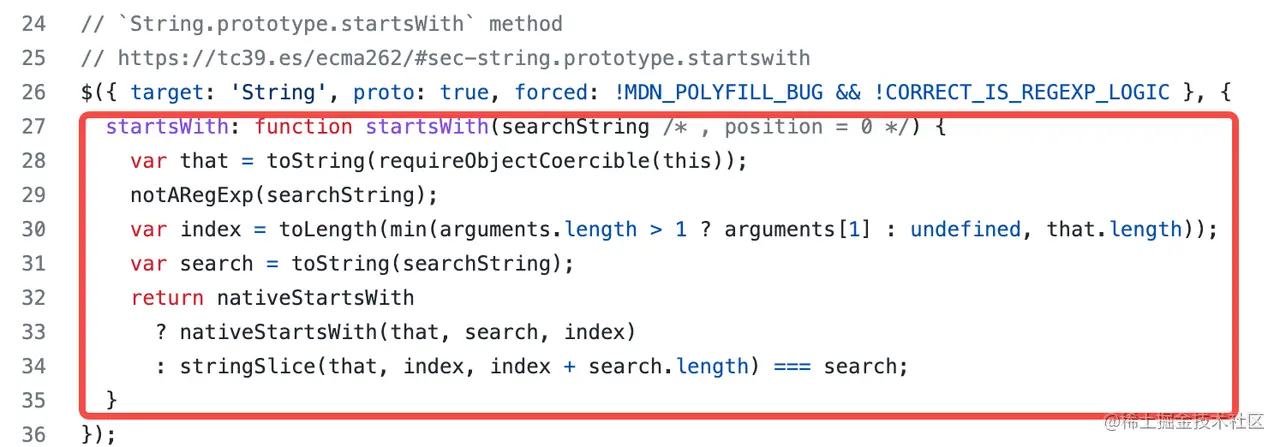 可以看到,代码顶部多了 require("core-js/modules/es.string.starts-with.js"),通过阅读 require 近来的源码,它内部实现了字符串的 startsWith 方法,这样就完成了 built-in 类型的转换。