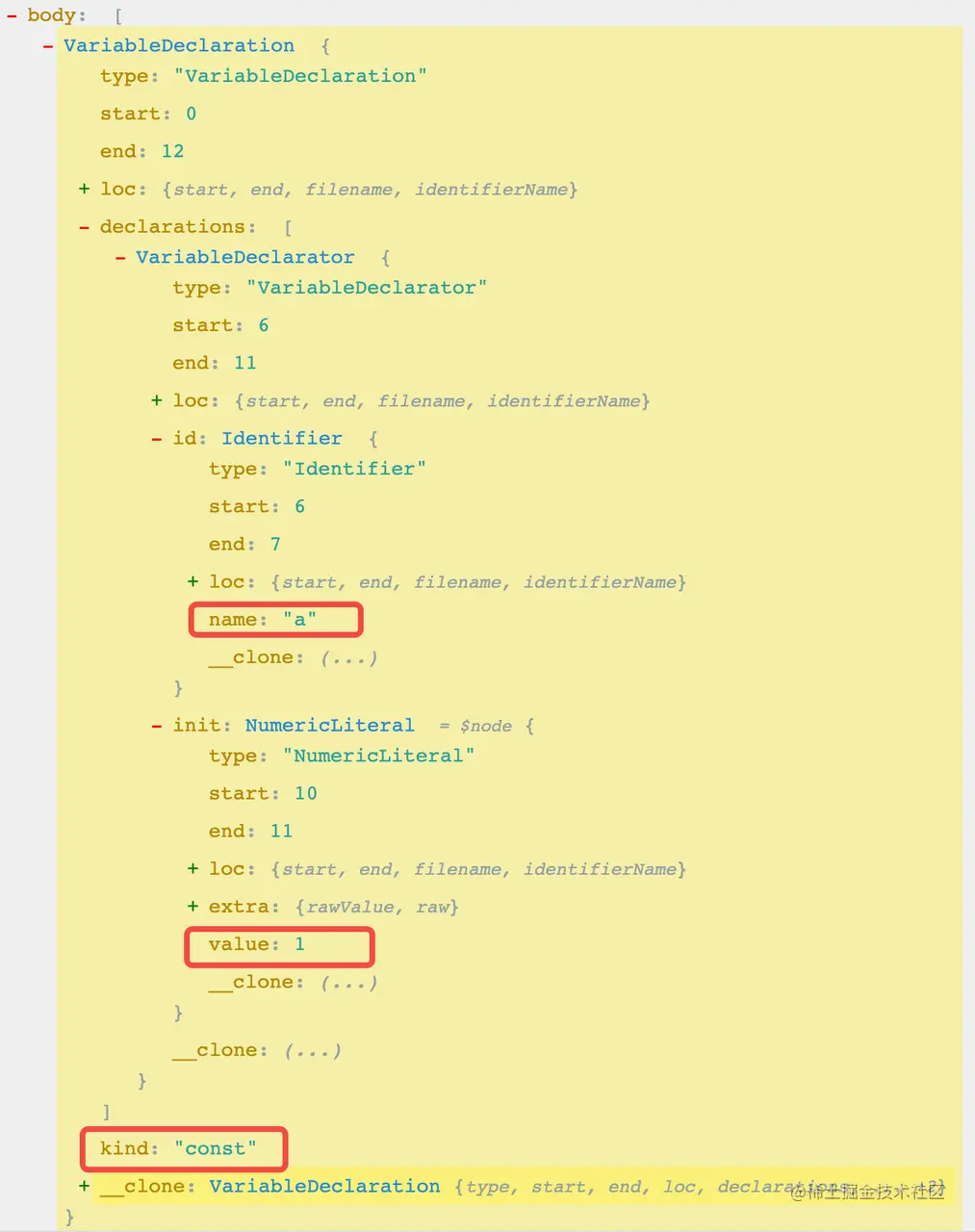 在 babel 中,以上工作是通过 @babel/parser 来完成的,它基于ESTree 规范,但也存在一些差异。从上图中,我们可以看到最终生成的 AST 结构中有很多相似的元素,它们都有一个 type 属性(可以通过官网提供的说明文档来查看所有类型),这样的元素被称作节点。一个节点通常含有若干属性,可以用于描述 AST 的节点信息。