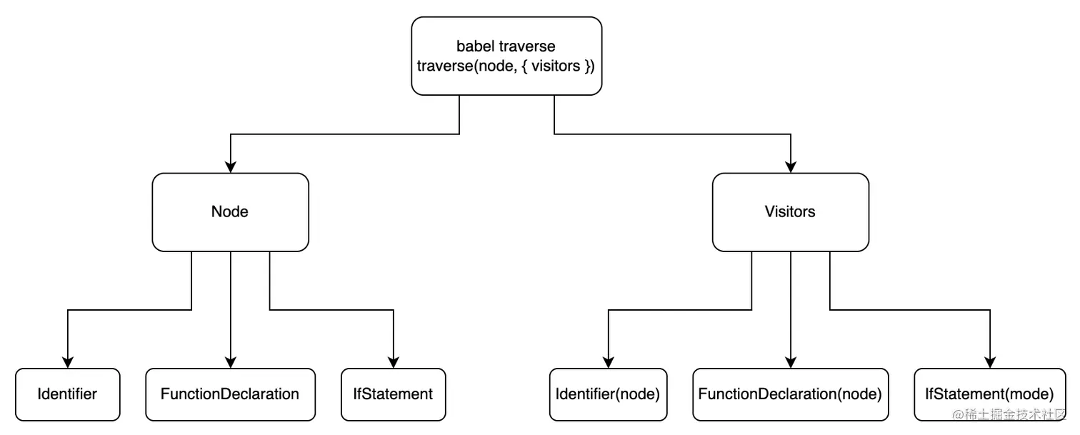 以上是 babel 转换阶段操作节点的思路,具体实现是:babel 维护一个称作 Visitor 的对象,这个对象定义了用于 AST 中获取具体节点的方法,如果匹配上一个 type,就会调用 visitor 里的方法,实现如下: