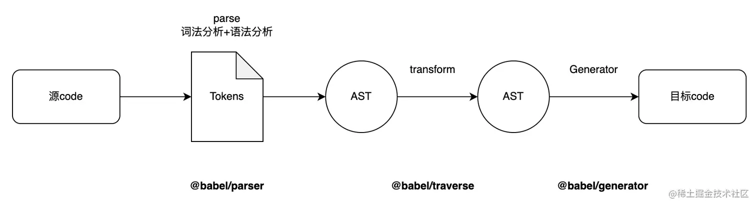 了解完成 babel 的基础使用后,我们来分析 babel 的工作原理。babel 作为一个编译器,主要做的工作内容如下: