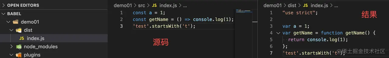 接下来,在命令行执行 npm run babel 命令,看看转换效果。