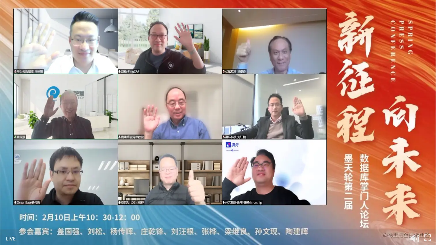 2月10日上午,墨天轮【2023春季发布会暨第二届数据库掌门人论坛】盛大开启,本次活动的主题为“新征程,向未来”,共包含2022年度中国数据库颁奖盛典、2022年度行业发展报告发布以及第二届数据库掌门人论坛三项议程。