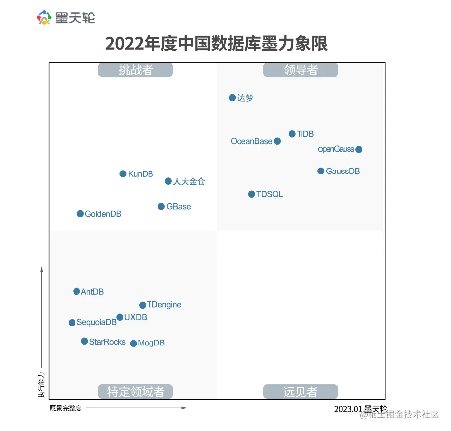 墨天轮选取2022年年度平均分排行前40的数据库产品,将38个衡量指标的数据汇总到了 愿景完整度(其衡量指标主要有学术成果、三方评测、生态、数据库技术等)和 执行能力(其衡量指标主要有2022年排行榜表现、Gartner 数据库魔力象限、市场份额等)两个维度,并根据各家供应商们的表现将其划分为领导者、挑战者、特定领域者和远见者四个象限。