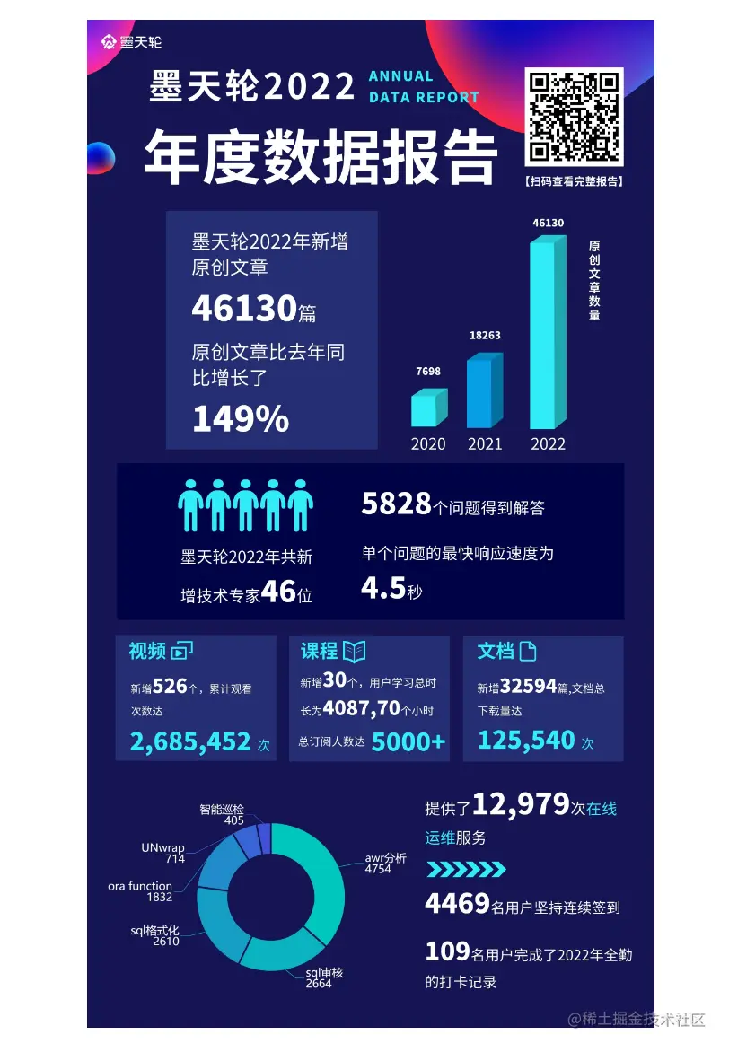 报告盘点过去的一年墨天轮与所有用户在网站内容建设、课程学习、技术活动等方向共同完成的“成绩单”,涵盖了排行榜、文章、数说、问答、行业报告等多个版块,欢迎大家浏览查阅!未来,墨天轮将继续秉持“以乐知乐享之志,成同心共济之果“的初心,与百万技术人一道打造有温度的技术社区。