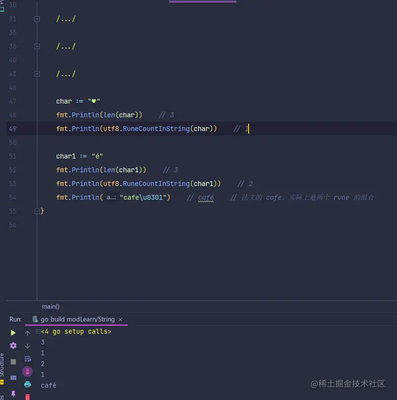 fmt.Println("cafe\u0301") // café // 法文的 cafe,实际上是两个 rune 的组合