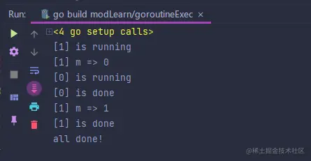 如图,main()主程序不等两个goroutine执行完就直接退出了。常见的解决办法:使用WaitGroup变量,它会让主程序等待所有goroutine执行完毕再退出。