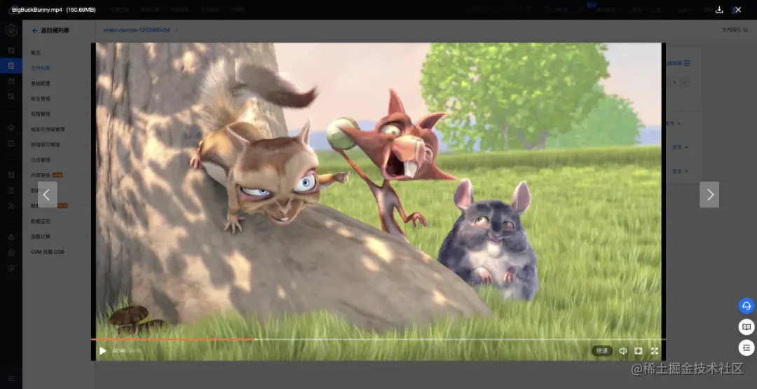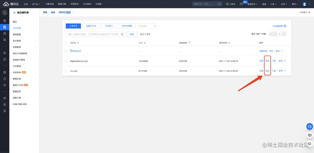 此外,COS 控制台还集成了视频的预览功能,您可以在 COS 控制台方便地预览您的视频文件。登陆腾讯云 COS 控制台,选择存储桶进入文件列表页,点击操作栏的预览按钮,即可进入预览模式。