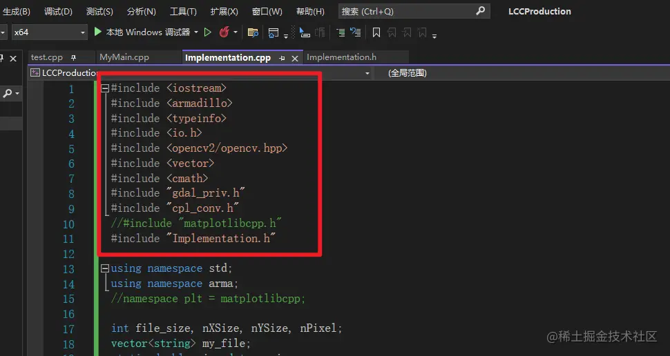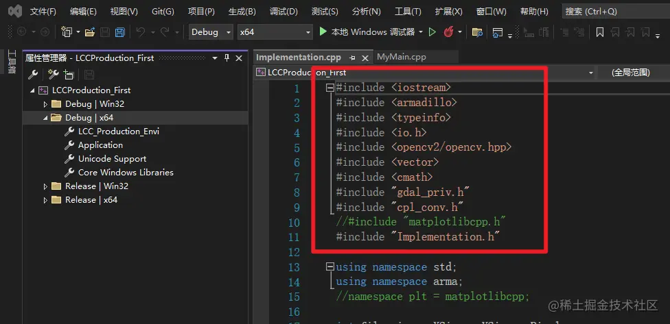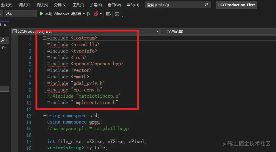 随后,我们新建了一个解决方案,且这一解决方案中的一个新的项目需要同样需要调用前述项目中Armadillo、OpenCV等多个不同的C++ 第三方库。如下图所示,由于此时我们还没有对新的项目进行第三方库的配置,因此在#include代码中会有报错信息存在。