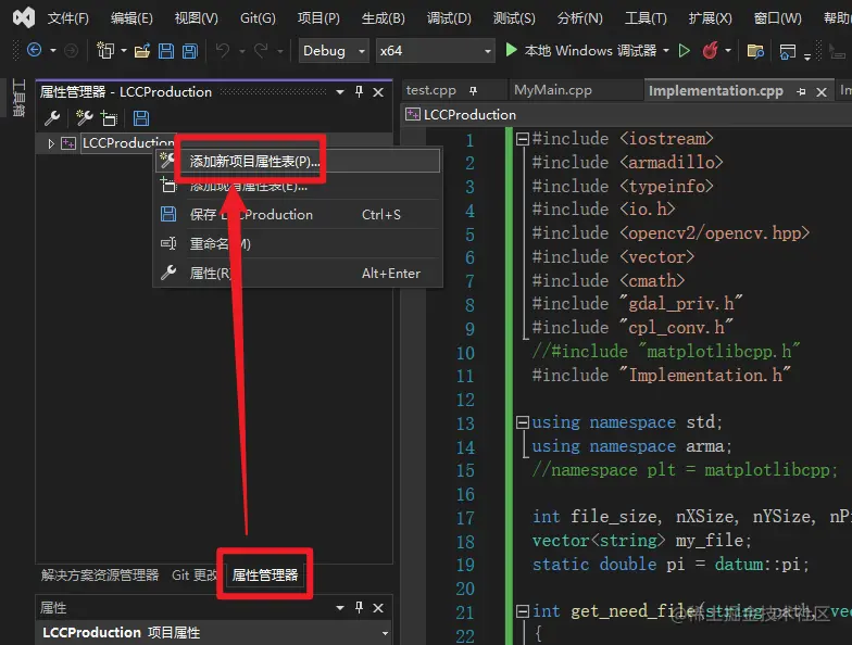 随后,在“解决方案资源管理器”附近,找到“属性管理器”,并双击项目名称将其展开;随后,基于我们代码需要运行的环境属性(比如Release还是Debug,Win32还是x64),将对应的属性信息展开,并右键选择“添加新项目属性表...”。如下图所示,我这里因为希望在Debug版本的x64环境下运行代码,因此就选择在这一环境属性信息对应处右键。