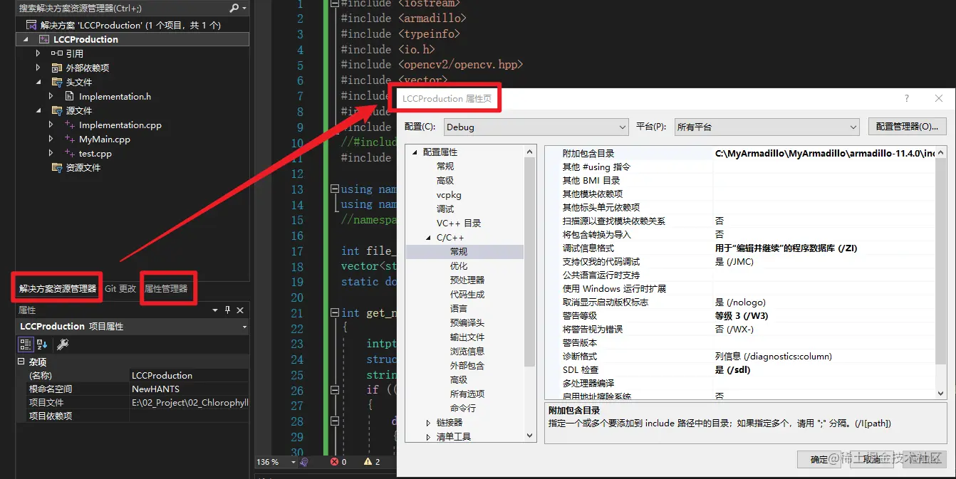 例如,我们现有一个解决方案,其中的一个项目需要调用Armadillo、OpenCV等多个不同的C++ 第三方库;我们也已经在这一项目中配置好了所需的各个第三方库,如下图所示。