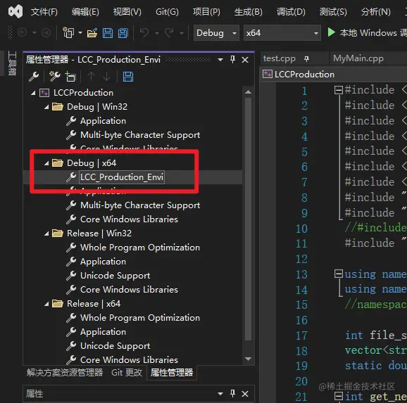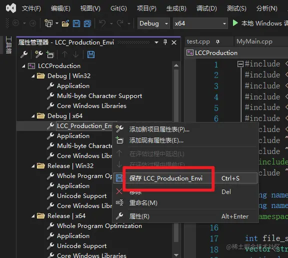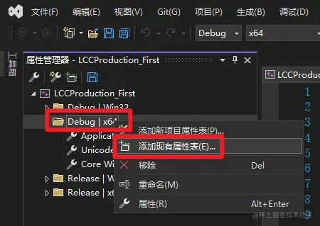 此时,就可以在Debug版本的x64环境对应的一项中,找到我们刚刚创建的属性表,并双击。