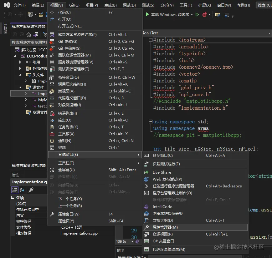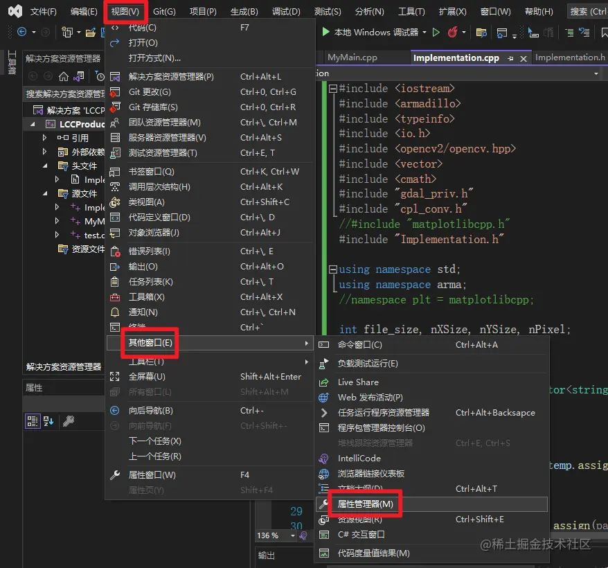 首先,我们需要在原有的项目(也就是已经配置好各类第三方库的项目)中,选择“视图”→“其他窗口”→“属性管理器”选项,如下图所示。
