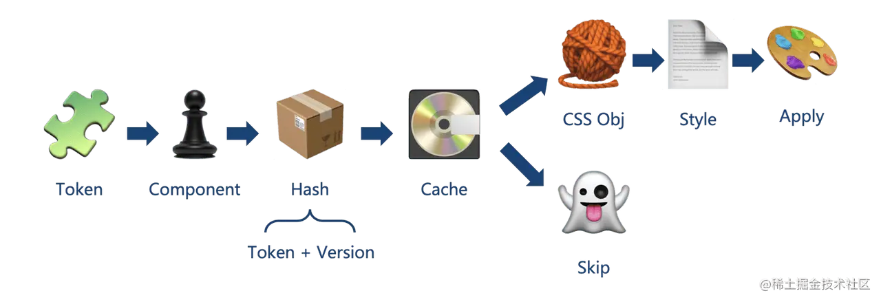 其实我们不难发现,问题其实在于序列化 css 的过程。如果通过缓存的方法去减少序列化 css 的次数呢?对于应用级的 CSS-in-JS 来说,我们很难去找到一个很合适的 key 去确认缓存。但是如果是组件库的话,最终得到的样式则是比较稳定的。根据我们从 v4 及之前版本确定下来的样式结构,每一个组件的样式在相同的主题变量和相同的版本下是不会改变的。反过来说,只有修改了主题变量,或者改变了 antd 的版本,样式才可能会变化。由此我们得到了一个非常简单的计算 hash 的方法: