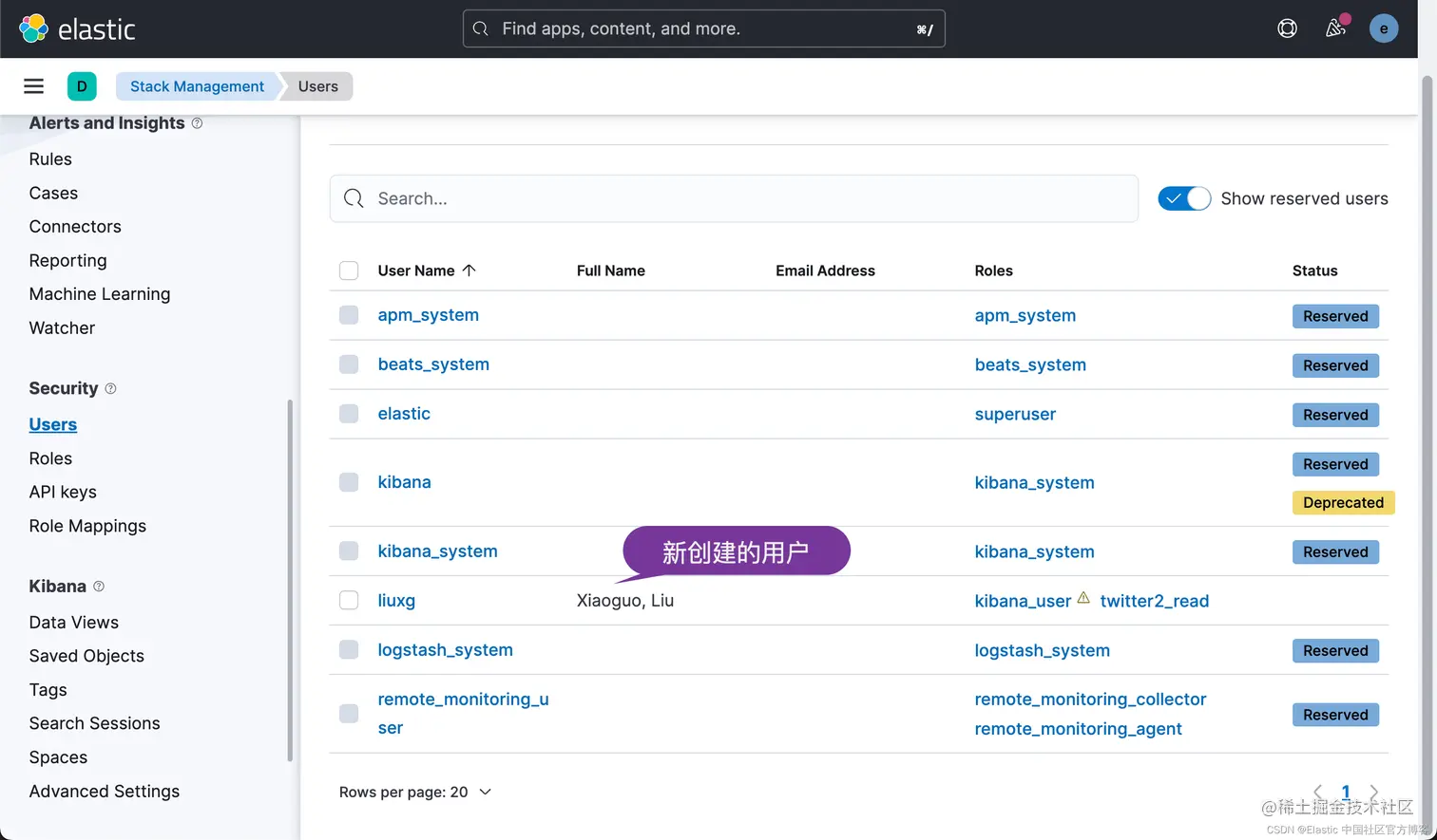 当我们创建上面的两个索引 twitter1 及 twitter2 时,我们可以在超级用户 elastic 登录的情况下创建。在 Kibana 的界面中,会显示该账号: