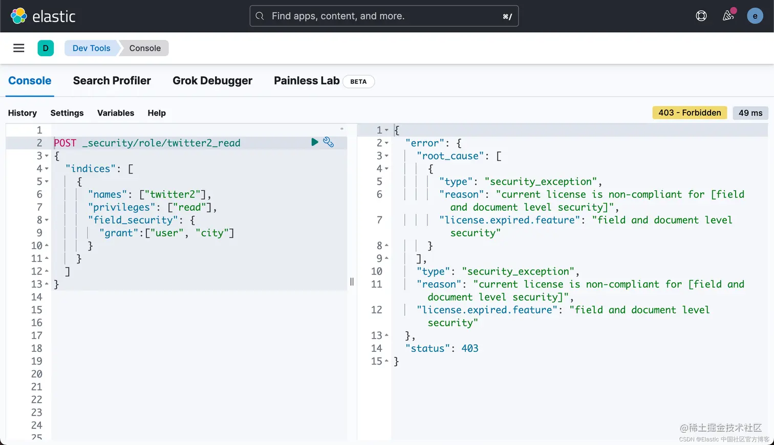 在我之前的文章 “Elasticsearch:运用 API 创建 roles 及 users” ,我展示了如何使用 Security API 来创建用户及角色来控制访问 Elasticsearch 中的索引。在今天的文章中,我将展示一个使用 Security API 来创建一个用户及角色来访问一个索引中的特定字段。这个功能属于白金版的功能之一。