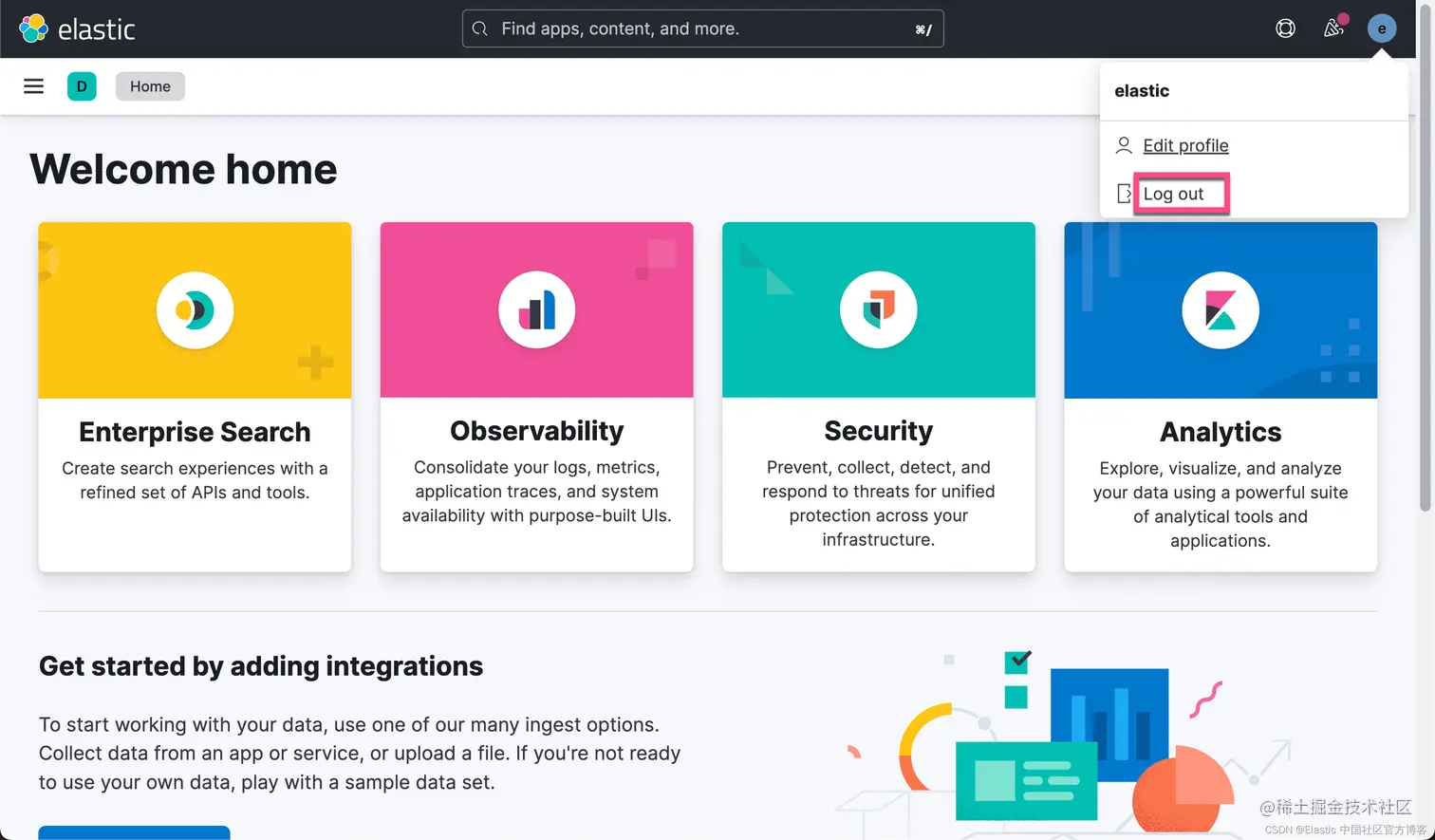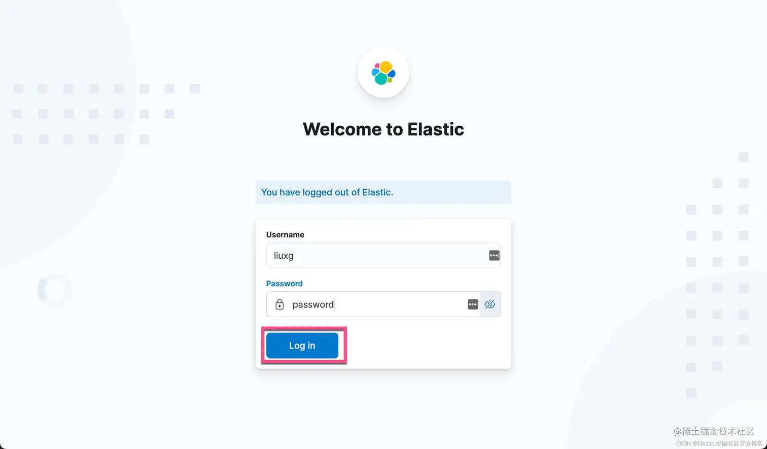 我们接下来登出之前的 elastic 超级用户,并以最新创建的账号 liuxg:password 来进行登录: