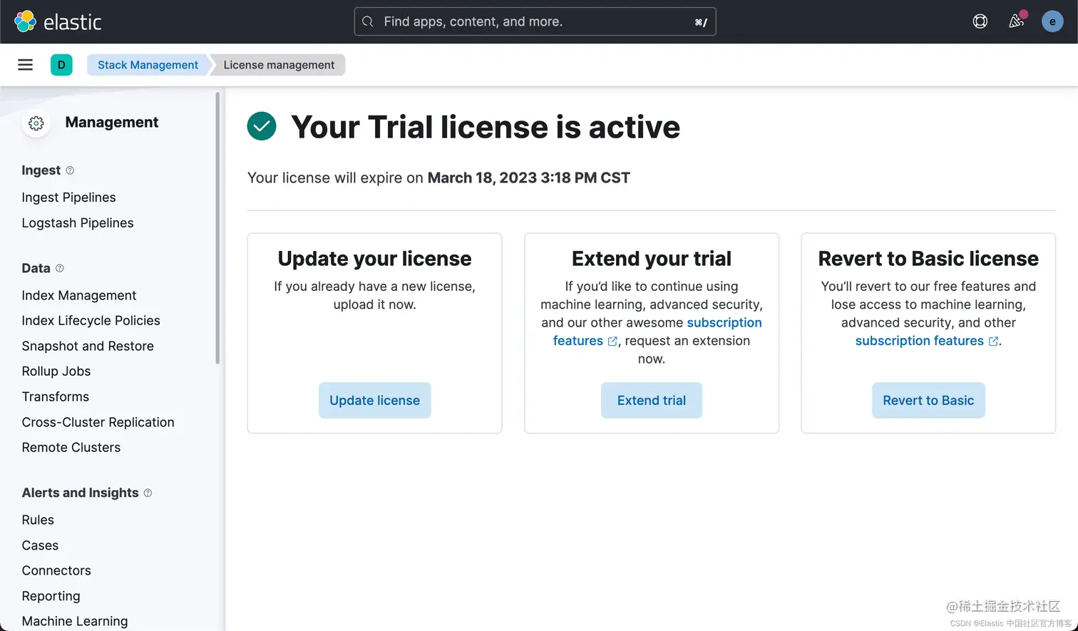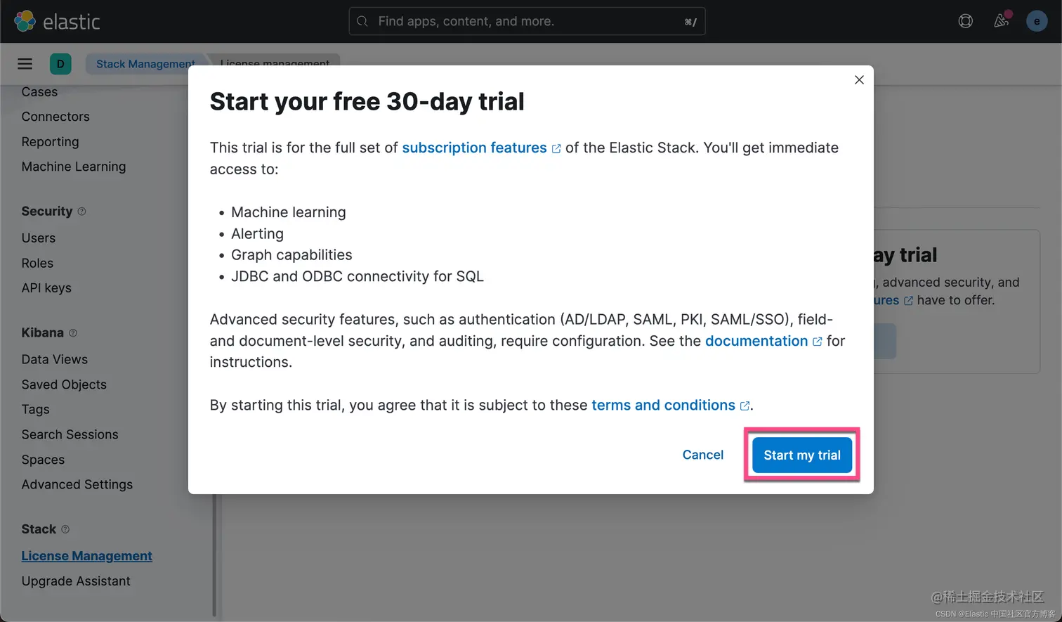 在我们没有购买授权的情况下,我们可以在 Kibana 中启动试用功能。