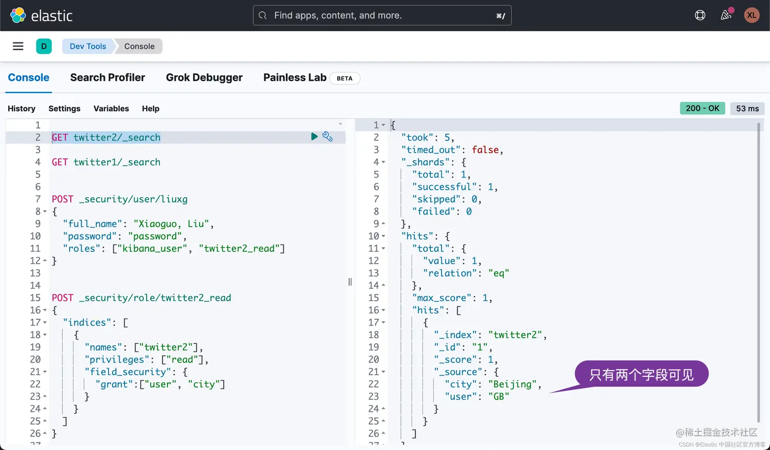 从上面的结果中可以看出来,我们只能看到两个字段 city 及 user,而其它的字段比如 uid,provice 和 country 都是不可见的。这个在实际的使用中非常用用。比如我们有同样的一个 employee 索引,可以供一个公司的几个不同的部门来使用。 人事部门可以看到员工的薪水,而一般员工是不可以看到员工的薪水这个字段。