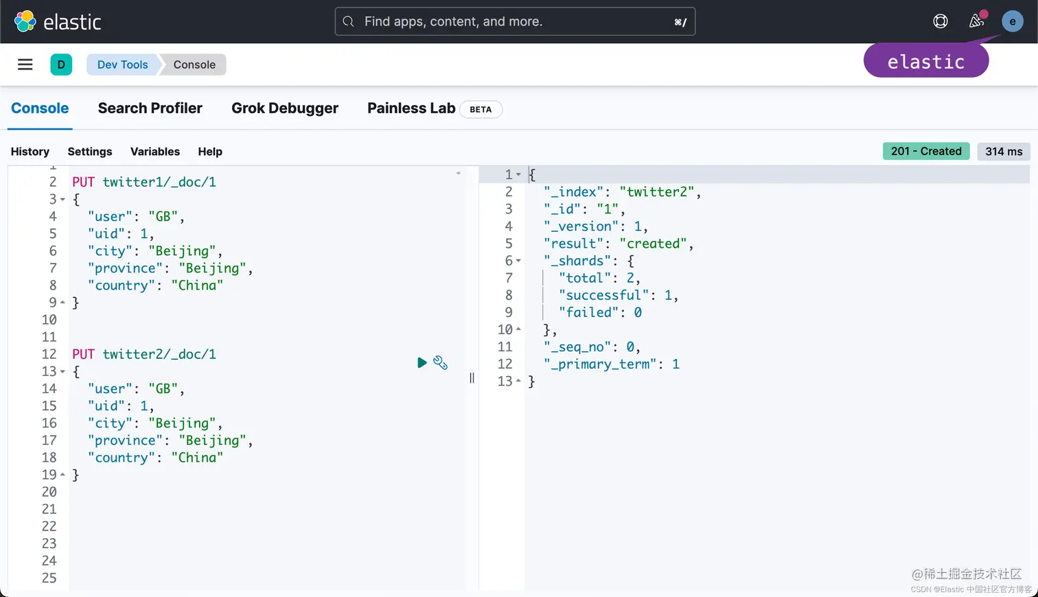 接下来,让我们来尝试写入一个文档到 twitter2 里去: