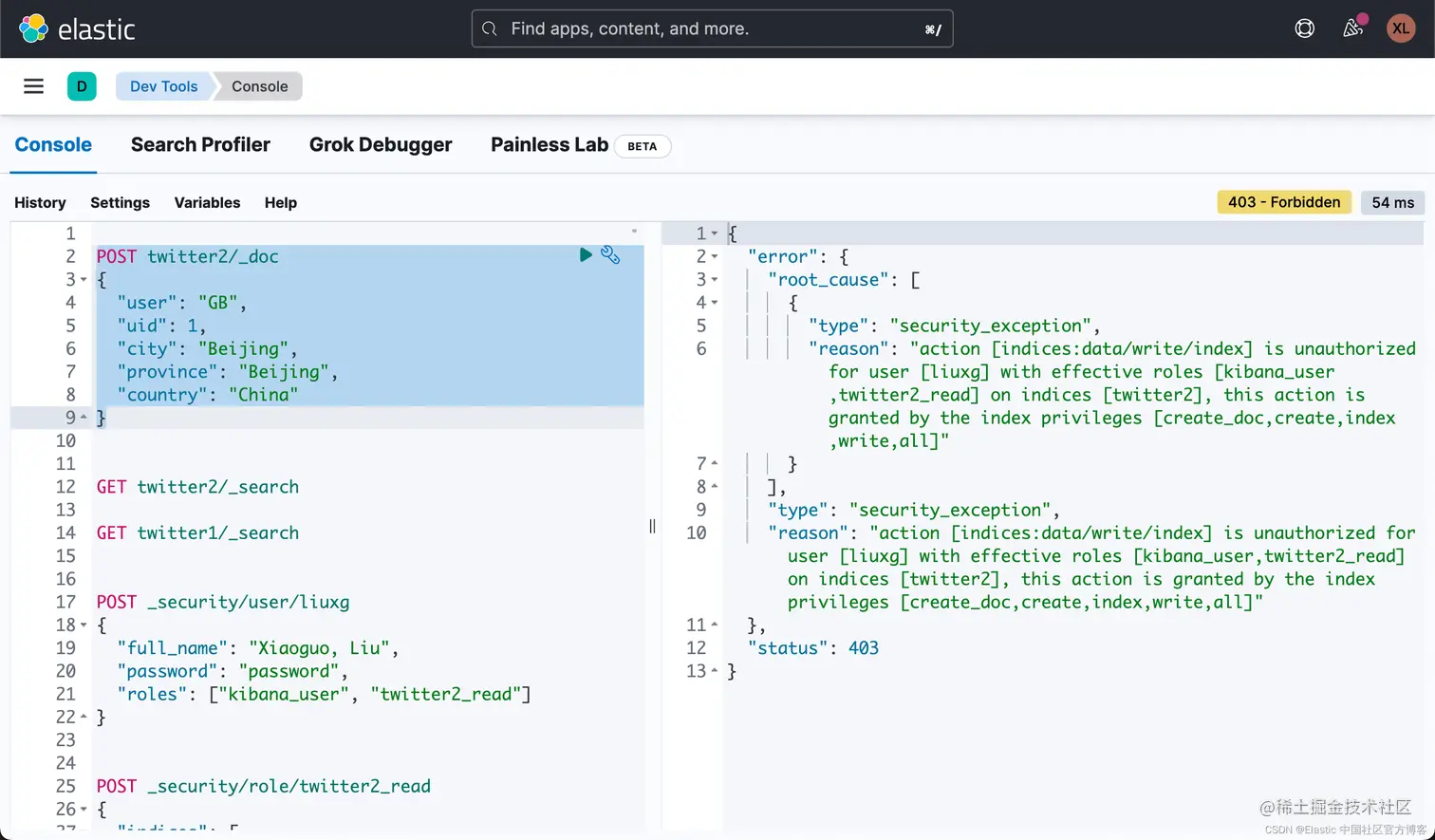 上面命令返回的结果表明 liuxg 这个用户不能访问 twitter1 这个索引,因为他没有相应的权限。