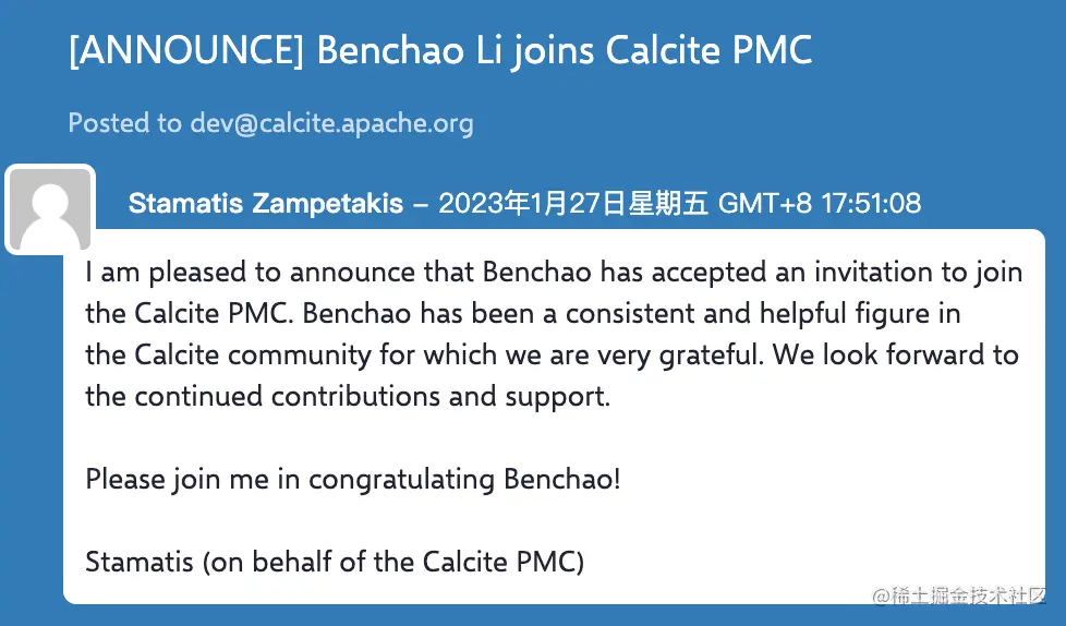 我的第一个 PR 是 22 年的 3 月份,当时正值疫情隔离在酒店,周末闲来无事就浏览一些技术相关的社区,刚好看到 Calcite 社区有人提出了 JSON 函数的缺陷,我们当时内部也在考虑在 Flink 上支持 JSON 函数,所以就尝试帮 Calcite 社区解决一下这个问题,没想到第一个 PR 在一个小时内就被合入了,当时感觉到社区小伙伴真的太热心了。受到社区氛围感染,我就开始了 Calcite 的贡献之旅。很快另一个惊喜又来了,在 6 月份就收到了成为社区 Committer 的邀请。在拿到 Committer 身份之后,我发现社区的 reviewer 资源其实是非常匮乏的,虽然很多 PR 都可以得到较快的响应,但是仍然存在一些 PR 得不到及时的处理,所以我就把更多精力放到了辅导其它贡献者上。到 23 年 1 月份,又收到了成为社区 PMC 的邀请。回首这 10 个月,是整个社区小伙伴们长期的奉献精神鼓舞着我一直坚持下来。