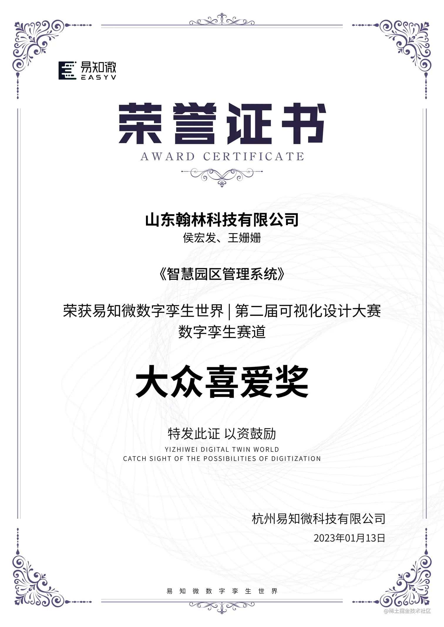 本次大赛共分为三个赛道同时进行:数据看板、数字驾驶舱、数字孪生赛道。其中,数字孪生赛道需要参赛选手们通过三维建模软件(C4D、U3D、UE4、Blender等),模拟物理世界的数字镜像还原「如智慧园区、智慧城市等大型的数字孪生应用场景」,配合EasyV平台实现可视化图表植入,呈现出数字孪生场景的数据状况。经过组委会的初轮筛选、专业评审团打分评定以及大众投票的多方综合评定,山东翰林科技有限公司UEDC设计师侯宏发、王姗姗两位设计师的作品“智慧园区管理系统”在“易知微第二届可视化设计大赛”数字孪生赛道中斩获二等奖、大众喜爱奖等奖项。