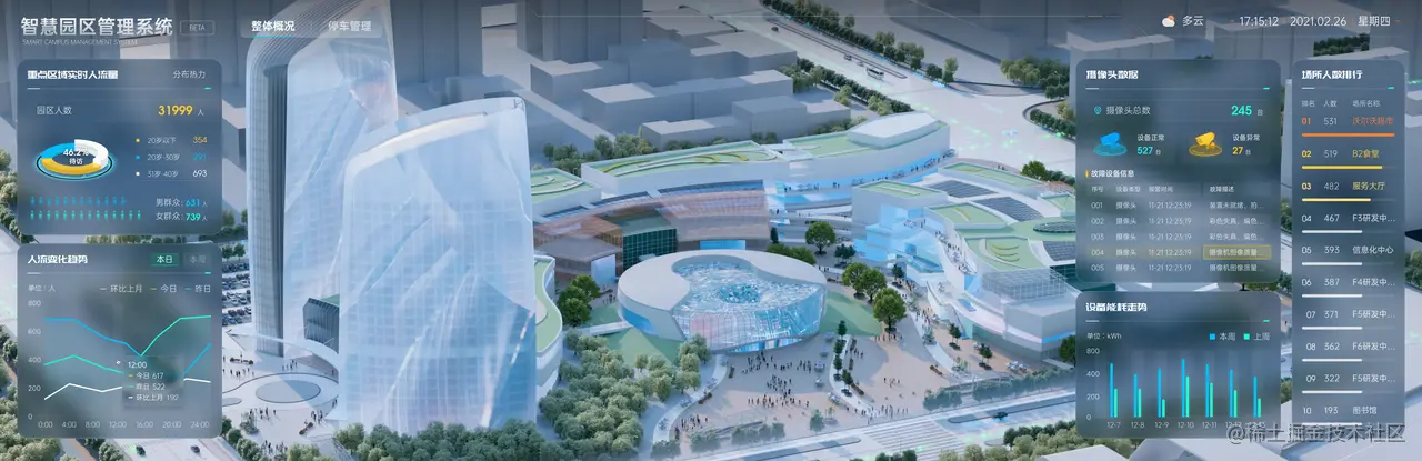 园区类场景一般面积较小,视角距离近,需要对模型细节控制比例呈现,以强调虚拟园区的现实感,物理感。该作品通过对园区边界虚化,将园区内外进行差异化表达,模型轮廓、颜色、光照上等有所区分,再通过为场景增加有光感的细节贴图,构建有序、和谐、统一的智慧园区风格。