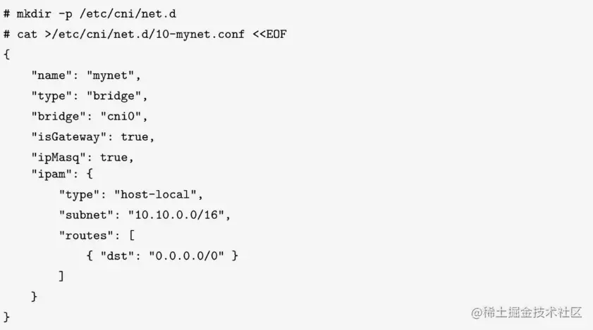 我们定义了一个名为mynet的网络。它是一个bridge模型,而IP地址管理(ipam)使用的是host-local,且可供分配的容器网段是10.10.0.0/16。