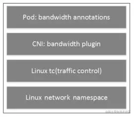 Pod带宽控制的底层技术栈如图3-12所示。用户通过Pod的annotations下发带宽限制数值,CNI的bandwidth插件调用Linux流量控制插件tc,在宿主机上应用tc配置。