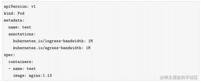 Kubernetes会自动为这个Pod分别限制上传和下载的带宽为1Mb/s。注意,需要自己在/etc/cni/net.d目录下写一个配置文件,例如my-net.conf: