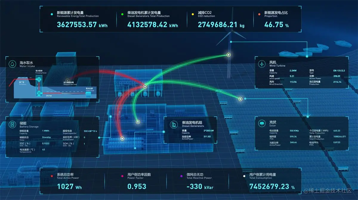 数字孪生智慧能源可视化监测系统通过采集各个能耗监测点的能耗和运行信息,形成能耗的分类、分项、分区域统计分析,对能源统一调度、优化能源介质平衡、降低综合能耗,助其更有效地使用能源,实现“节能管理,绿色增效”。