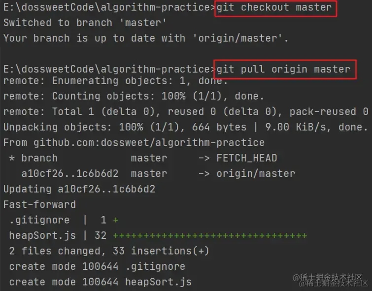 就需要先执行checkout切换分支到master分支,然后执行git rebase操作,这样就会以array-algorithm的最新一次提交作为新的基底,并把master分支公共父节点之后的版本追加到新基底之后~